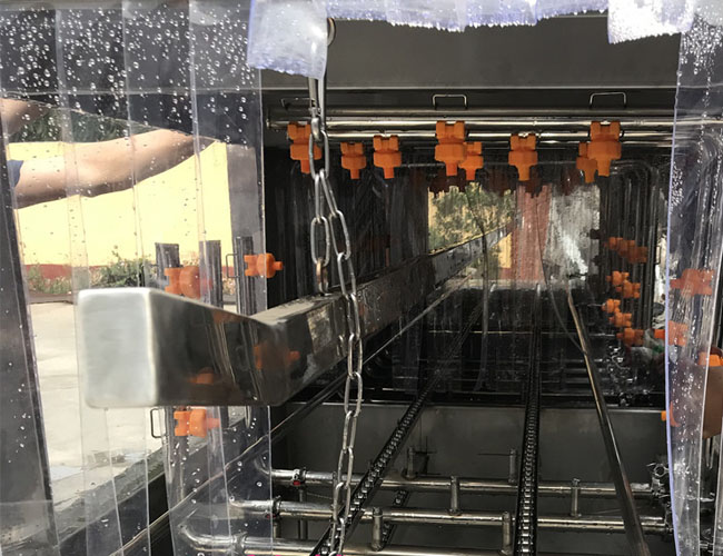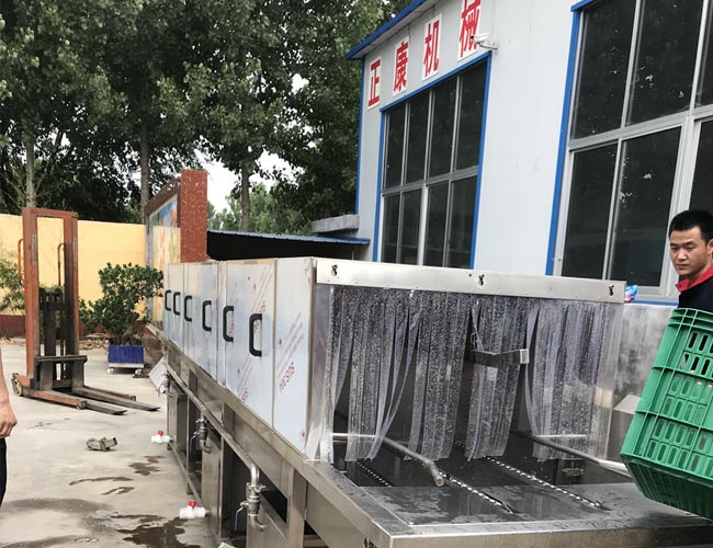 正康全自動周轉(zhuǎn)筐清洗機適用于各種塑料筐,雞蛋筐,清潔筐,主要清洗原理是通過軌道載動框子往前行走,走過三個清潔走廊,周轉(zhuǎn)筐清洗機第1步是用溫水跟洗劑液或者堿水對箱子進行高溫高壓噴射清洗,能有效去除污漬油渣油漬,第二部是熱堿水清洗,第三部為清水沖洗,可根據(jù)客戶每天的清洗量來定制洗筐機的長度,每個水龍頭都有特殊工藝制造,不易損壞,四面噴水,耐高溫材質(zhì),清洗水箱分為兩組,沒組都帶有過濾裝置,清洗室兩側(cè)的門都可以打開,方便清潔維修保養(yǎng),進出口用軟門簾封閉防水,人性化設(shè)計。正康周轉(zhuǎn)筐清洗機設(shè)備特點,速度溫度可調(diào)節(jié),操作自動化。雙層過濾網(wǎng),可隨時清理,可調(diào)節(jié)毛刷,清洗更干凈,管路減震鏈接,不摩擦下面軌道,運行更穩(wěn)定。毛刷刷洗段,消毒水噴淋段以及烘干段可根據(jù)客戶要求定制。